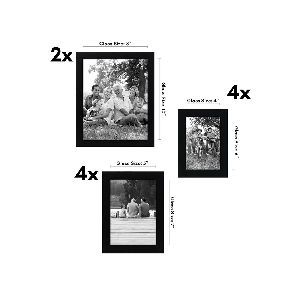 • 10 Set Black Photo Frames: This 10 pack of black picture frames includes (4) 4×6 inch frames, (4) 5×7 inch frames and (2) 8×10 inch frames; perfect for you creating a gallery wall. Hang these on a wall, or on a desktop – hanging hardware and easel stands are included.