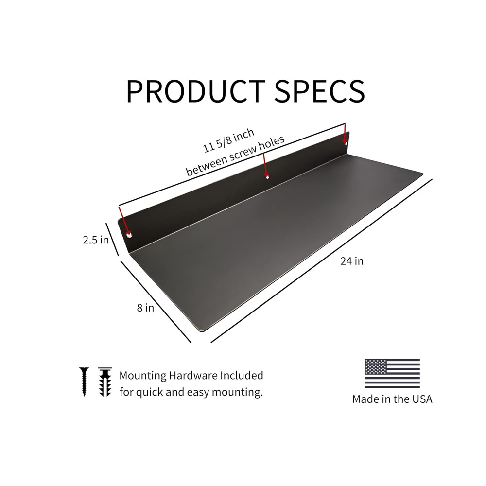 - DIMENSIONS & DETAILS: Measuring 24-inches long x 8-inches in depth, our steel floating shelf is made from 14 gauge raw steel. It’s perfect for displaying books, plants, bottles, picture ledges, and retail displays