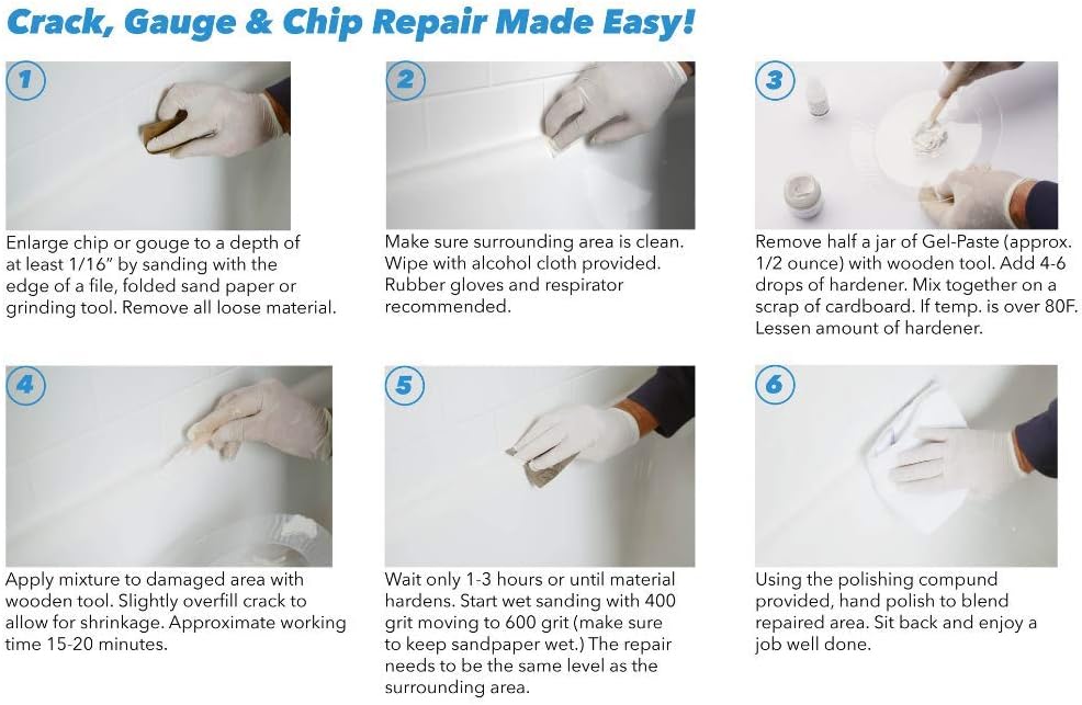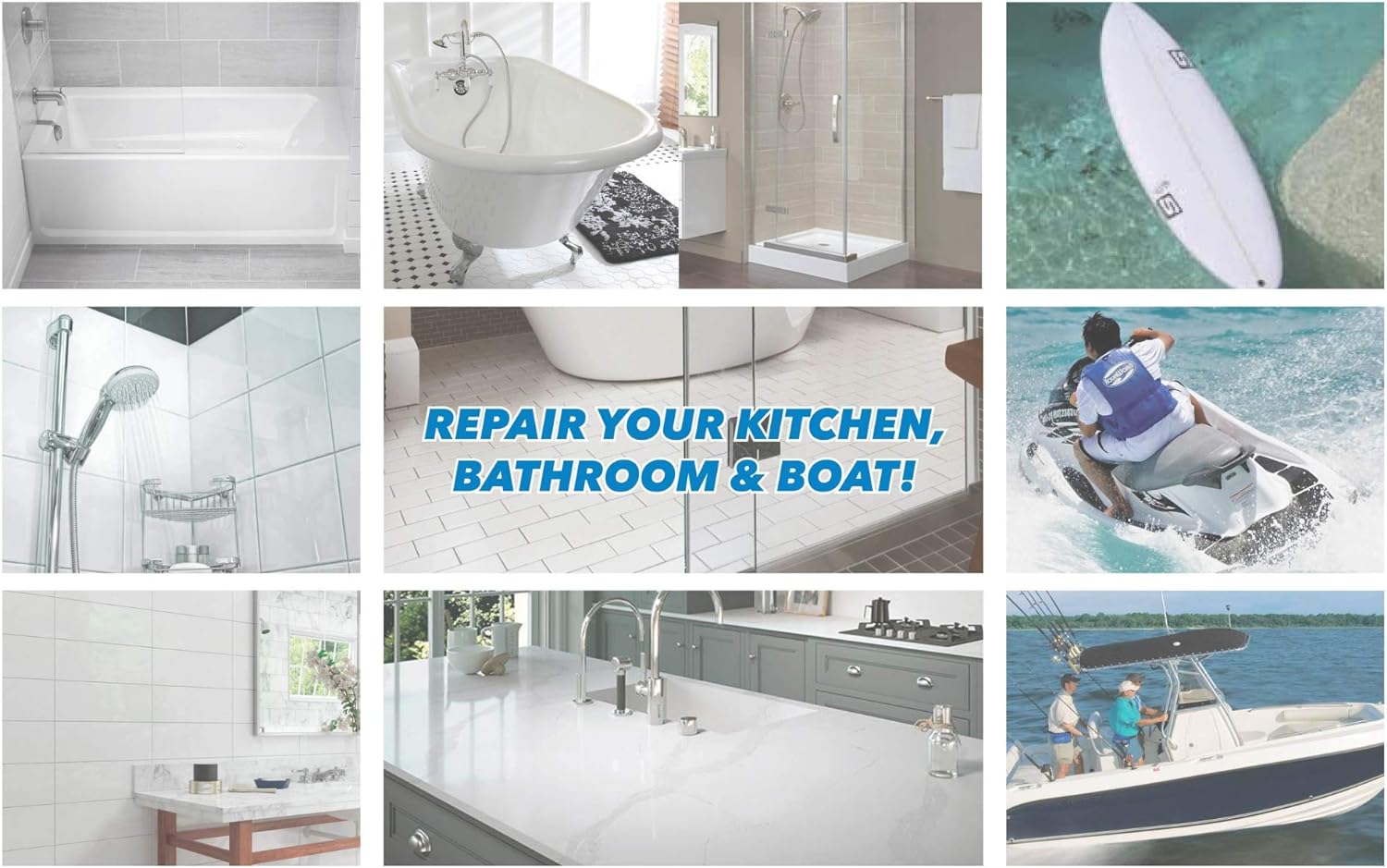 - Repairs minor nicks, gouges and scratches on bath tubs, sinks, showers, boats, surfboards and jet skies. Works on many material surfaces such as ceramic, granite, porcelain, acrylic, fiberglass, formica, resin stone and enamel.